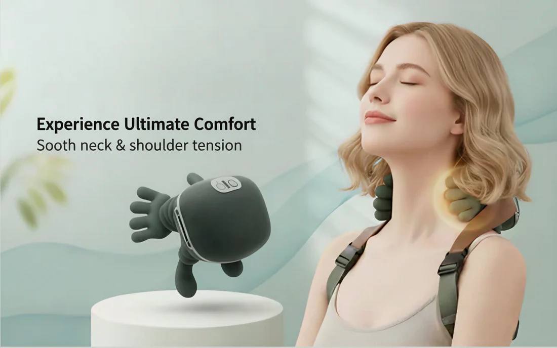 The HomiWellio Massager is a therapist-approved device designed to relieve muscle tension, stiffness, and fatigue in the neck, shoulders, and upper back. It uses deep-kneading massage nodes and soothing heat to replicate professional massage techniques.